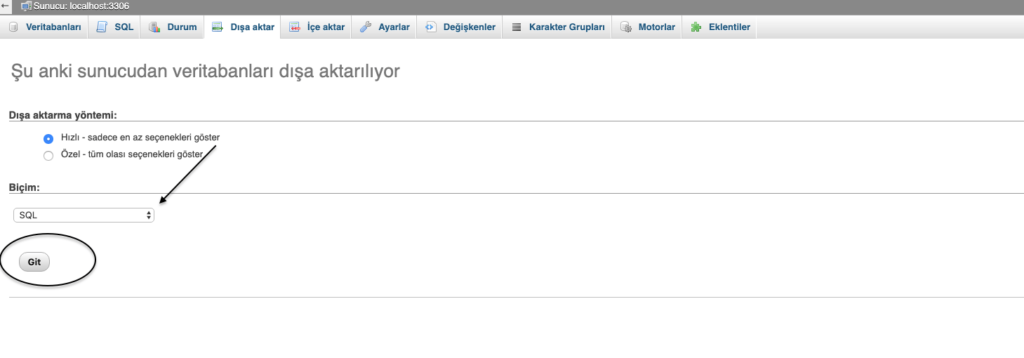 Dışa aktar seçeneğine tıkladıktan sonra karşınıza üstteki görseldeki gibi bir alan açılacaktır. Burada veritabanını ne şekilde aktarmak istediğinizi seçip aşağıdan Git e basarak ilgili veritabanı yedeğini bilgisayarınıza indirebilirsiniz. Dışa aktarma ayarları genellikle default geldiği şekli ile bırakılmalıdır ( default hali üst görselde mevcuttur) Siz ekstra bir işlem yapmayacaksınız bu özellikleri değiştirmeyin.